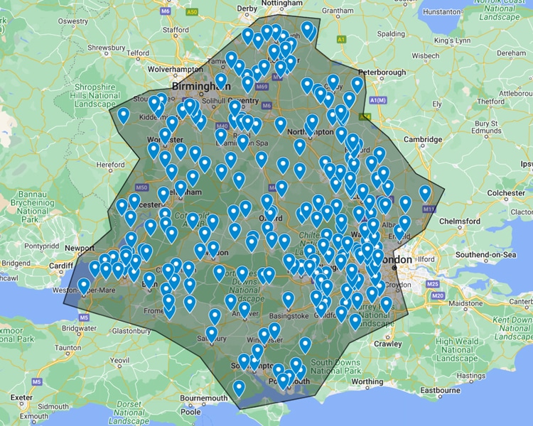 We cover a wide area of Oxfordshire, Northamptonshire, Leicestershire, Warwickshire, Worcestershire, Gloucestershire, Avon, Wiltshire, Hampshire, Berkshire, Surrey, Middlesex, Hertfordshire, Bedfordshire and Buckinghamshire!